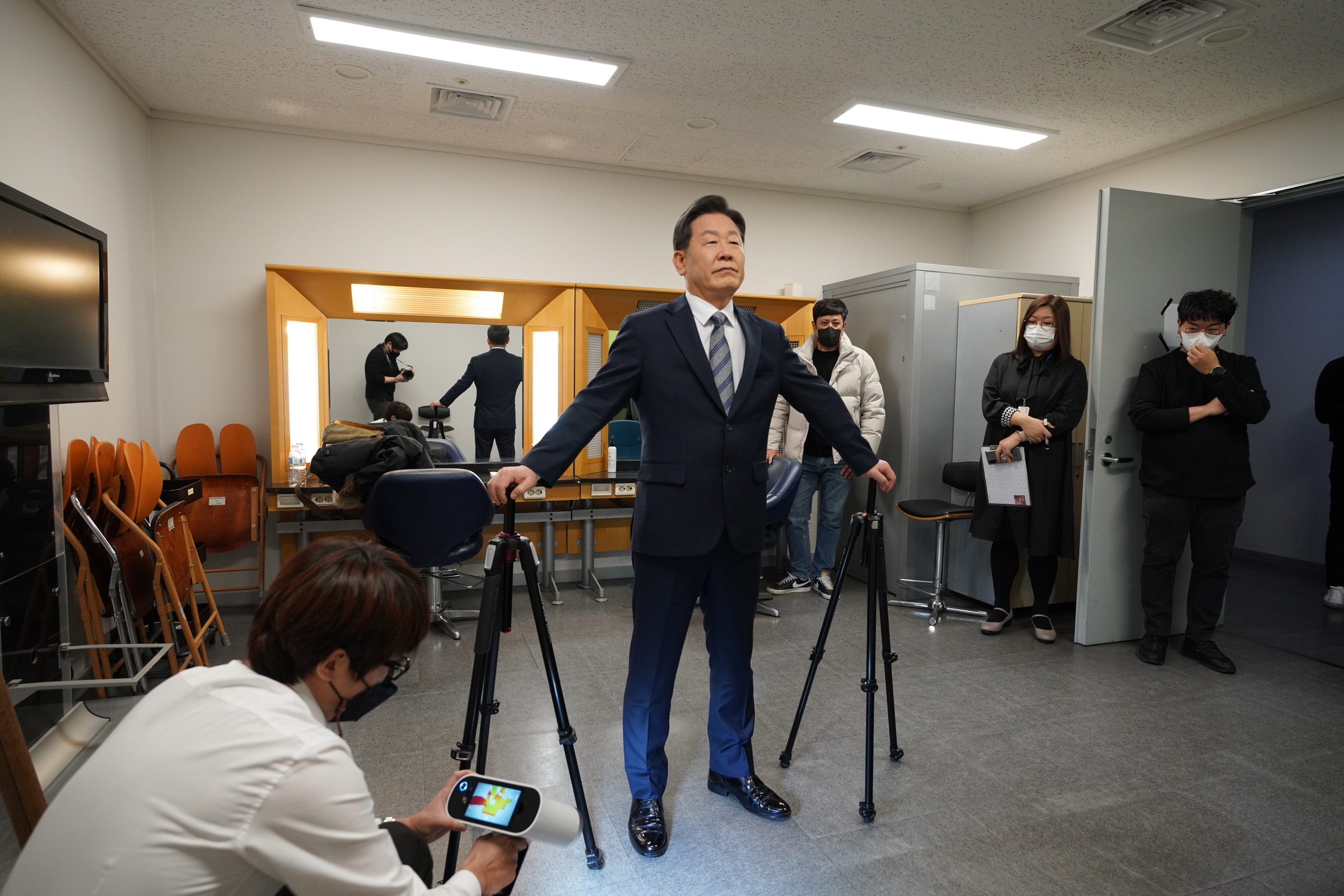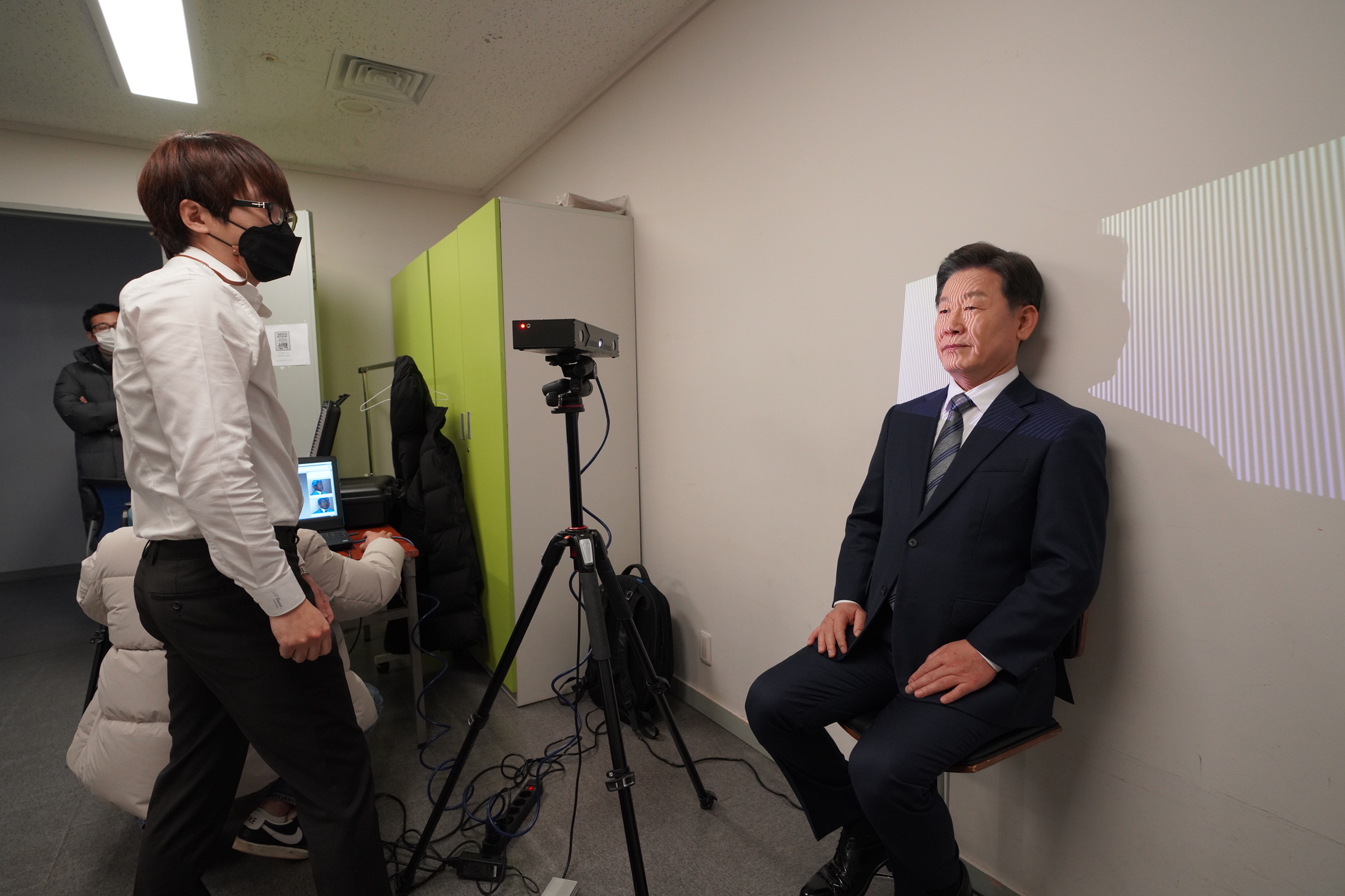 일반적으로 대통령급 인물을 촬영할 때에는 여러 가지 변수들이 존재하기 때문에 사전 준비 단계부터 디테일하게 체크리스트를 구성하였고, 최소한의 세팅으로 최대 품질을 이끌어내는 방향으로 스캔을 진행했습니다. 특히 촬영 장소는 전문 스튜디오가 아닌 사무실 느낌의 실내였기 때문에, 부스형 스캐너 대신 휴대용스캐너를 활용했습니다.