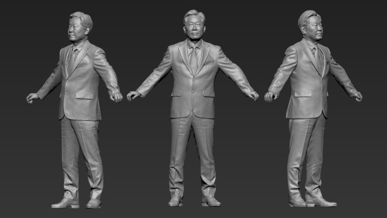 이번 작업은 단순히 실사 형태를 재현하는 데서 그치는 것이 아니라, 향후 다양한 매체 (디지털 아카이브, VR/AR 콘텐츠, 정치사 박물관 전시용 피규어 등)에 활용될 수 있는 확장성을 고려한 데이터셋 구축이 목적이었기에, 메쉬의 퀄리티와 최적화 수준에 특히 많은 시간을 투자했습니다. 고폴리와 저폴리 모두 컬러 텍스처와 함께 구성되어 후처리 없이 즉시 활용 가능한 형태로 납품되었습니다. 이재명 대통령님의 특유의 눈빛, 입매, 이마 주름과 같은 디테일 요소들이 모두 표현될 수 있도록 메시 기반 디테일링도 추가적으로 진행했으며, 텍스처는 높은 해상도로 출력해 조형물 제작에도 무리가 없는 수준으로 세팅했습니다.